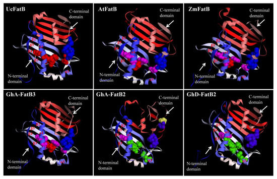 Three-dimensional structure models of GhFatB protein monomers. All 3D structures were predicted on Swiss-Model (https://swissmodel.expasy.org/) (accessed on 12 October 2021) with UcFatB (AAA34215.1) as the template. Files of 3D structure of GhFatBs were displayed in Discovery Studio 4.1 software. Blue bolls show the AAs affect enzyme activities in the C-terminal domain, whereas yellow bolls represent the varied AAs different from that of UcFatB. Red bolls represent the AAs as being the same as the UcFatB in N-terminal domain. Pink bolls show the variant AAs different from UcFatB while green bolls show the additional residues different from UcFatB, AtFatB, and ZmFatB in the domain.