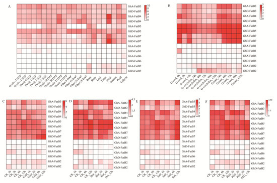 Transcriptional expression patterns of 14 GhFatB genes in various cotton tissues. The mRNA abundance was measured by the FPKM value (Fragments per kilobase of transcript per million mapped reads). The high value of FPKM represents the high expression level. The darkness of red color indicates the expression level. (A) Expression levels of 14 GhFatB genes in various cotton tissues including developing ovules (−3, −1, 0, 1, 3, 5, 10, 20, 25 and 35 DAF), developing fibers (5, 10, 20 and 25 DAF), vegetable tissues (root, stem, and leaf) and flower tissues (torus, petal, stamen, pistil, and calycle). (B) Expression levels of 14 GhFatB genes in various tissues of cotton seed germination including germinating seeds (0, 5, and 10 h), cotyledon (24, 48, 72, 96, and 120 h) and roots (24, 48, 72, 96, and 120 h). (C–F) Expression levels of 14 GhFatB genes in cotton leaves treated with cold stress (C), hot stress (D), salt stress (E) and drought stress (F), respectively. All the RNA-seq data used here were obtained from the Cottonfgd database (https://cottonfgd.org/) (accessed on 6 October 2021).