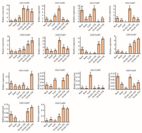 To further verify the expression patterns of GhFatB genes, qRT-qPCR analysis was employed to examine the transcript abundance in roots, stems, leaves and developing ovules of upland cotton (15, 25 and 35 DAF). As shown in Figure 5, eight GhFatB genes (GhA/D-FatB3, GhA/D-FatB4, GhA/D-FatB5 and GhA/D-FatB7) were highly expressed in all tested tissues compared with the six other GhFatBs (GhA/D-FatB1, GhA/D-FatB2 and GhA/D-FatB6). Such qRT-qPCR data were consistent with the expression profiles of those genes revealed by transcriptome analysis (Figure 4A). Furthermore, these eight GhFatBs displayed higher expression levels in the developing ovules than in the vegetative tissues, especially high expression in the early-developing ovules (15 DAF), such as GhA-FatB3 and GhD-FatB4. Notably, five out of the eight genes (GhA-FatB3, GhA-FatB4, GhD-FatB4, GhA-FatB5 and GhA-FatB7) were highly expressed in ovules with a peak in the early stage (15 DAF), followed by slightly reduced expression levels in the middle and late stages of ovule development (Figure 5). However, along with ovule development, GhD-FatB3, GhD-FatB5 and GhD-FatB7 showed a gradually increasing expression pattern with a peak at the late stage of ovule development (35 DAF) (Figure 5). Overall, compared with vegetative organs, most of the GhFatB genes expressed highly in seeds, with much higher levels of GhA-FatB3 and GhD-FatB4 in the early stage of seed development, followed by higher levels of GhD-FatB3, GhD-FatB5 and GhD-FatB7 in the late stage of seed development. This expression profiling indicates that GhA-FatB3 and GhD-FatB4 may be responsible for the highest accumulation of C16:0 in the early stage of developing seeds.