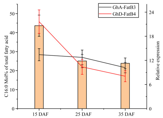 The correlation of the expression of GhA-FatB3 and GhD-FatB4 with molar percentage of C16:0 in the developing cotton seeds. The columns show the C16:0 content (mol% of total fatty acids) and lines for the relative expressions of the target genes (Black for GhA-FatB3, Red for GhD-FatB4). Six biological replicates were analyzed for all samples.