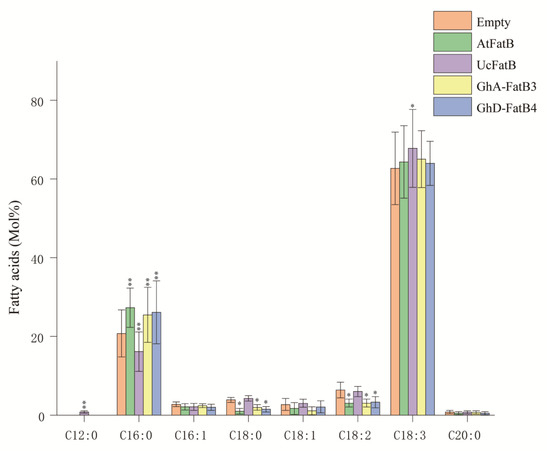 To further identify the catalytic activity and substrate preference of GhFatBs, we selected GhA-FatB3 and GhD-FatB4 as the targets based on the analysis above. The recombinant plasmids containing GhA-FatB3 or GhD-FatB4 genes were transiently expressed in N. benthamiana leaves by Agrobacterium, respectively. Recombinant plasmids of 12:0-specific UcFatB or 16:0-specific AtFatB were selected as the positive controls to be transiently expressed in the leaves, respectively, because these two genes have been thoroughly characterized for their substrate specificities [13,25]. An empty vector was used as the negative control. Fatty acid profiles were examined for the tobacco leaves transiently expressing the target genes. As shown in Figure 7, the overexpression of GhA-FatB3 or GhD-FatB4 resulted in an increased level of C16:0, with 4.73 mol% and 5.36 mol% in the leaves, respectively. Meanwhile, contents of C18:0, C18:1 and C18:2 decreased slightly in the infected leaves compared to the empty-vector control leaves (Figure 7). As the positive control gene, overexpression of AtFatB also led to an obvious enhancement of C16:0 accumulation, with 6.55 mol% in the infected leaves. Unlike 16:0-specific FatBs, the overexpression of UcFatB caused new fatty acid (C12:0) synthesis up to a small amount (0.83 mol%) and also a decrease in the C16:0 level by 4.63 mol% (Figure 7). The consistent fatty acid profiles detected in the tobacco leaves transiently expressing GhA-FatB3, GhD-FatB4 and AtFatB, respectively, revealed that both GhA-FatB3 and GhD-FatB4 had a high substrate specificity for 16:0-ACP, thus leading to the high-level accumulation of palmitic acid in cottonseed oil.