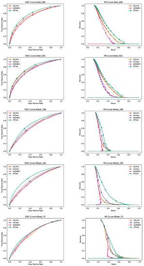 As seen in Section 3.1, our datasets are highly imbalanced. Of the two curves, ROC and PR, it is the PR curve which better represents the performance of various methods for skewed data [31]. Note also that both curves do not depend on any threshold for their value, thus giving a better overall view of the method’s performance. The connection between the PR curve and our threshold described above is that a good PR curve is far away from the origin and the threshold represents the intersection point between the PR curve and the main diagonal. It tells therefore how far from the origin the curve is along the main diagonal.