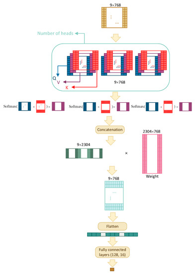 As illustrated in Figure 3, the input is of size and the attention layer, depending on the number of heads (three, in the figure), creates multiple sets of Query, Value, and Key matrices. These matrices are the results of multiplication between embeddings and different weight matrices whose values are tuned through training. The model then uses the following equation to capture information from each head: