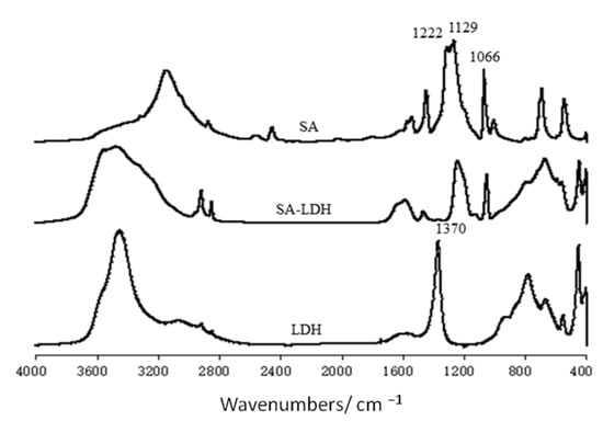 The peak at 1370 cm−1 in the spectrum of LDH was assigned to the carbonate stretching, which disappeared in the spectrum of SA-LDH with several newly emerged peaks. The peaks at 3320 and 3268 cm−1 were due to the stretching vibration of -NH2. The peaks at 1222, 1129, and 1066 cm−1, which corresponded to the vibrations of S=O in SA, also appeared in SA-LDH, which documented the existence of NH2SO3− in SA-LDH.