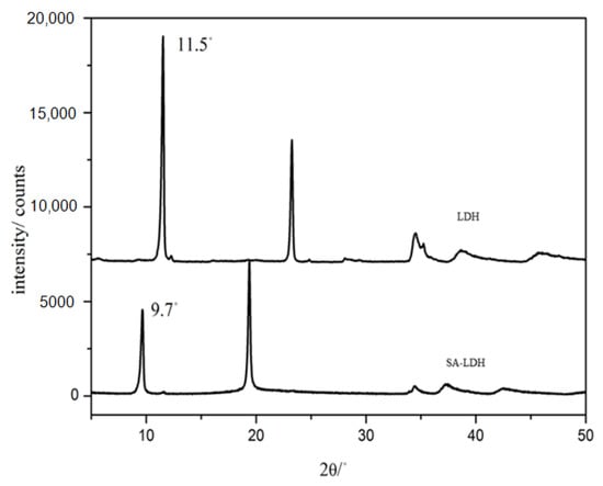 Figure 2 shows the XRD patterns of LDH and SA-LDH. The pristine LDH presented a basal spacing of 0.76 nm (2θ = 11.5°), which was enlarged to 0.91 nm (2θ = 9.7°) after the intercalation by SA. The increase in basal spacing indicated that NH2SO3- had been successfully intercalated into the interlayers of LDH. According to Equation (5), the intercalation ratio reached approximately 98%.