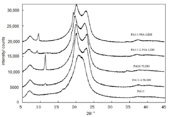 LDH have been used as flame retardants in PP [,,] and EVA [,], but little efforts in PA11 have been reported. Some studies have documented that low-content LDHs (≤5%) can improve the mechanical performance of PA6 [], PA66 [], and PA11 []. It has been proposed that nano-sized particles can change the crystal behavior of PA and hence improve the mechanical performance [,].