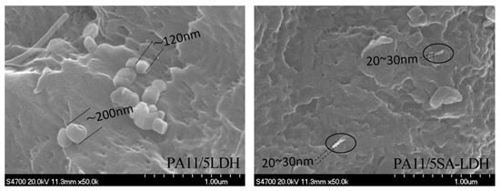 The dispersion of LDH and SA-LDH was also observed by SEM. As shown in Figure 4, the scatter of LDH and SA-LDH in PA11 was obviously different. LDH molecules were inclined to aggregate with an approximate single particle size of 100~200 nm, which was much larger than the value calculated from XRD patterns in Table 1. The observed size of SA-LDH in PA11 from SEM was about 20~30 nm, which was consistent with the XRD calculation in Table 1. The SEM observation further illustrated a better distribution of SA-LDH than LDH in PA11.