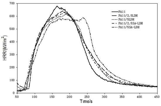 Based on the HRR curves shown in Figure 5, one can see that after the addition of LDH or SA-LDH, the HRR curves became wider and shifted slightly right. The tendency to form two peaks can be found through the addition of 5 phr SA-LDH, reflecting that the time to pHRR was distinctly prolonged, from 161 s in PA11 to 237 s after 5 SA-LDH introductions. A slight decrease on the pHRR and slight increase on the THR at same time can be found from the relative data in Table 3.