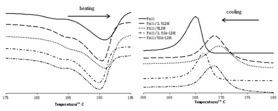 From the heating DSC traces shown in Figure 6, it can be observed the melt temperature of PA11 decreased slightly after the addition of LDH or SA-LDH. However, according to the data listed in Table 4, the maximal decrease was 1.3 °C, and the quantity of LDH or SA-LDH provided limited change on the melt temperature. Differently, the cooling curves in Figure 6 and data in Table 4 indicate that 2.5 or 5 phr LDH was 3.4 or 4.4 °C higher in crystal temperature compared with PA11. Similarly, 2.5 or 5 phr SA-LDH was 1.2 or 3.2 °C higher, implying that the crystallization happened earlier.