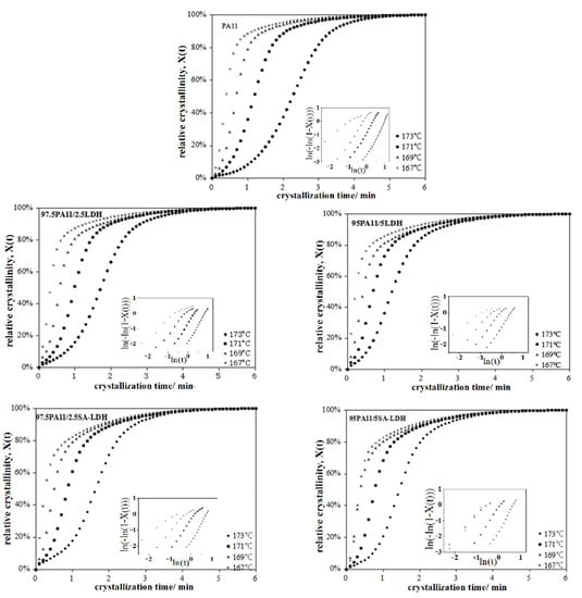 The effect of incorporating LDH and SA-LDH on the crystal behavior of PA11 was further investigated by DSC. Isothermal crystallization was carried out by DSC curves. Samples were heated from 40 to 200 °C at 10 °C/min; held at 200 °C for 5 min to ensure complete melting; then cooled to 167, 169, 171, and 173 °C at a rapid rate of 80 °C/min; and held until the whole crystallization process was complete. The selection of crystal temperature referred to the crystal temperature scope reflected by the cooling curves.