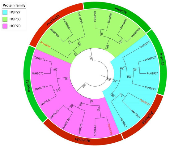 The phylogenetic tree constructed from the deduced amino acid (AA) sequences of HSP27, HSP60, and HSP70 in P. pseudoannulata, Archinda and Insecta. Numbers at the nodes are bootstrap values (1000 replications). The organisms and accession numbers were as follows: DvvHSP27 = Diabrotica virgifera virgifera (XP028134524.1), PdHSP27 = Polistes dominula (XP015186657.1), PcHSP27 = Polistes canadensis (XP014612919.1), VcHSP27 = Venturia canescens (XP043268524.1), PpHSP27 = Pardosa pseudoannulata (ON808409), AbHSP27 = Argiope bruennichi (KAF8778562.1), PtHSP27 = Parasteatoda tepidariorum (XP015921832.1),PpHSP60 = P. pseudoannulata (ON808407), AbHSP60 = A. bruennichi (KAF8796449.1), AvHSP60 = Araneus ventricosus (GBN34335.1), CdHSP60 = Caerostris darwini (GIX94638.1), HiHSP60 = Hermetia illucens (XP037915503.1), ScHSP60 = Stomoxys calcitrans (XP013103765.1), PgHSP60 = Pseudomyrmex gracilis (XP020293187.1), MpHSP60 = Monomorium pharaonis (XP012536851.1),TpHSC70 = Trichogramma pretiosum (XP014221706.1), NvHSC70 = Nasonia vitripennis (XP001599525.2), SfHSC70 = Sogatella furcifera (QIQ19556.1), NlHSC70 = Nilaparvata lugens (AQP31367.1), DsHSC70 = Dermacentor silvarum (XP037555227.1), RmHSC70 = Rhipicephalus microplus (XP037283294.1), IsHSC70 = Ixodes scapularis (XP029836651.2), PtHSC70 = P. tepidariorum (XP042896938.1), PpHSC70 = P. pseudoannulata (ON808408).