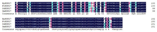 Multiple alignment of the deduced AA sequence of PpHSP27 with that of other species. Pt, P. tepidariorum (XP015921832.1); Sd, Stegodyphus dumicola (XP035231886.1); Sm, Stegodyphus mimosarum (KFM65662.1).