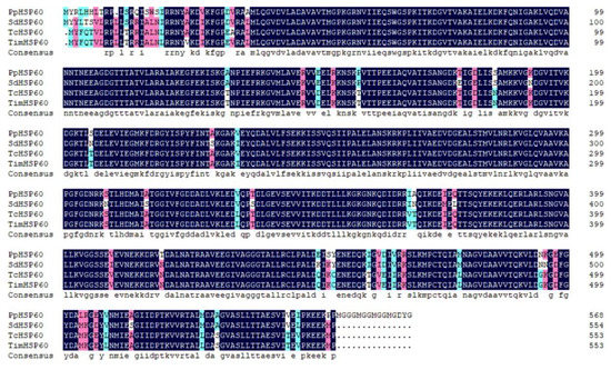 Multiple alignment of the deduced AA sequence of PpHSP60 with that of other species. Sd, S. dumicola XP035231886.1; Tc, Trichonephila clavata GFR30939.1; Tim, Trichonephila inaurata madagascariensis GFS44331.1.