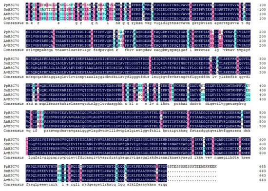 Multiple alignment of the deduced AA sequence of PpHSC70 with that of other species. Sm, S. mimosarum KFM81131.1; Ab, A. bruennichi KAF8774081.1; Av, A. ventricosus GBM18724.1.