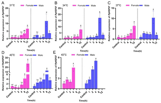 Relative mRNA expression of PpHSP27 in P. pseudoannulata after high temperature stress. (A) 31 °C treatment group, (B) 34 °C treatment group, (C) 37 °C treatment group, (D) 40 °C treatment group, (E) 43 °C treatment group. Each value represents the mean ± standard deviation (SD) of three replications (n = 3). Separate one-way Analysis of Variances (ANOVAs) were used for each temperature and gender, followed by pairwise comparisons at different time points using Tukey’s Honest Significant Difference (HSD) method with different lowercase letters indicating significant differences in pairwise comparisons (P < 0.05). No data were available at 43 °C of 8 h and 12 h exposure due to the death of tested spiders.