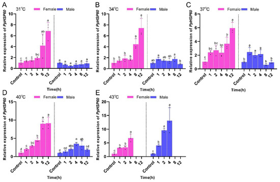 Relative mRNA expression of PpHSP60 in P. pseudoannulata after high temperature stress. (A) 31 °C treatment group, (B) 34 °C treatment group, (C) 37 °C treatment group, (D) 40 °C treatment group, (E) 43 °C treatment group. Each value represents the mean ± SD of three replications (n = 3). Separate one-way ANOVAs were used for each group of temperature or gender, followed by pairwise comparisons at different time points using Tukey’s HSD method with different lowercase letters indicating significant differences in pairwise comparisons (P < 0.05). No data were available at 43 °C of 8 h and 12 h exposure due to the death of tested spiders.