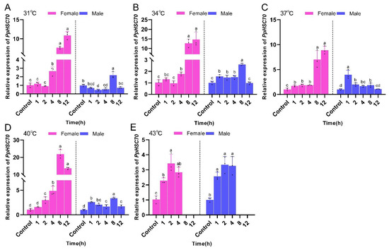 Relative mRNA expression of PpHSC70 in P. pseudoannulata after high temperature stress. (A) 31 °C treatment group, (B) 34 °C treatment group, (C) 37 °C treatment group, (D) 40 °C treatment group, (E) 43 °C treatment group. Each value represents the mean ± SD of three replications (n = 3). Separate one-way ANOVAs were used for each group of temperature or gender, followed by pairwise comparisons at different time points using Tukey’s HSD method with different lowercase letters indicating significant differences in pairwise comparisons (P < 0.05). No data were available at 43 °C of 8 h and 12 h exposure due to the death of tested spiders.