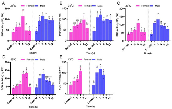 Superoxide dismutase (SOD) activity in P. pseudoannulata after high temperature stress. (A) 31 °C treatment group, (B) 34 °C treatment group, (C) 37 °C treatment group, (D) 40 °C treatment group, (E) 43 °C treatment group. Each value represents the mean ± SD of three replications (n = 3). Separate one-way ANOVAs were used for each group of temperature or gender, followed by pairwise comparisons at different time points using Tukey’s HSD method with different lowercase letters indicating significant differences in pairwise comparisons (P < 0.05). No data were available at 43 °C of 8 h and 12 h exposure due to the death of tested spiders.