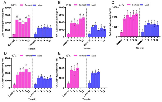Catalase (CAT) activity in P. pseudoannulata after high temperature stress. (A) 31 °C treatment group, (B) 34 °C treatment group, (C) 37 °C treatment group, (D) 40 °C treatment group, (E) 43 °C treatment group. Each value represents the mean ± SD of three replications (n = 3). Separate one-way ANOVAs were used for each group of temperature or gender, followed by pairwise comparisons at different time points using Tukey’s HSD method with different lowercase letters indicating significant differences in pairwise comparisons (P < 0.05). No data were available at 43 °C of 8 h and 12 h exposure due to the death of tested spiders.