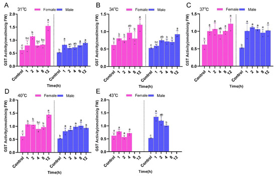 Glutathione transferase (GST) activity in P. pseudoannulata after high temperature stress. (A) 31 °C treatment group, (B) 34 °C treatment group, (C) 37 °C treatment group, (D) 40 °C treatment group, (E) 43 °C treatment group. Each value represents the mean ± SD of three replications (n = 3). Separate one-way ANOVAs were used for each group of temperature or gender, followed by pairwise comparisons at different time points using Tukey’s HSD method with different lowercase letters indicating significant differences in pairwise comparisons (P < 0.05). No data were available at 43 °C of 8 h and 12 h exposure due to the death of tested spiders.