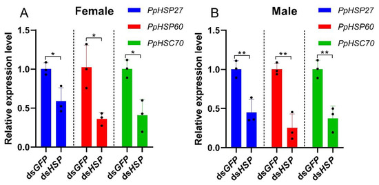 Transcription levels of the PpHSP27, PpHSP60, and PpHSC70 genes after silencing. Each value represents the mean ± SD of three replications (n = 3). The * means significant differences between dsGFP and dsHSP according to a Student’s t-test. (* P < 0.05 and ** P < 0.01).