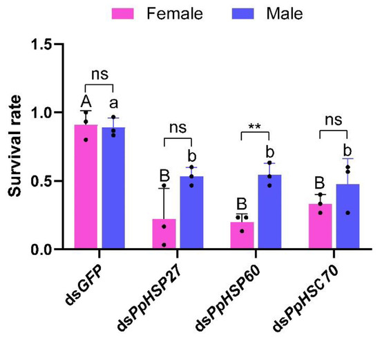 After injection of dsPpHSP27, dsPpHSP60, and dsPpHSC70, the survival rates of male and female P. pseudoannulata were significantly lower than that of the control group injected with dsGFP after exposure to high temperature stress at 43 °C for 4 h. After 4 h of high temperature stress at 43 °C, the survival rates of female P. pseudoannulata injected with dsPpHSP27, dsPpHSP60, and dsPpHSC70 were 22%, 20%, and 33%, respectively, which was significantly lower than the 91% of the control group (F = 19.655, df = 11, P < 0.05). The survival rates of male P. pseudoannulata were 53%, 54%, and 48%, respectively, significantly higher than 89% in the control group (F = 8.575, df = 11, P < 0.05) (Figure 12). These results indicated that knockdown of the three HSP genes can significantly reduce the heat tolerance of P. pseudoannulata to high temperatures.
