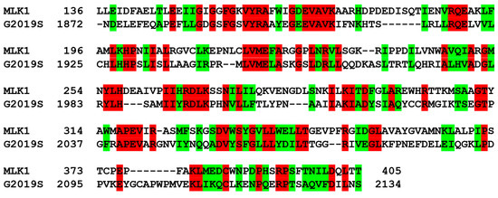 Amino-acid sequence alignment between the kinase domains of MLK1 and the G2019S mutant of LRRK2. Identical and similar residues are colored in red and green, respectively.