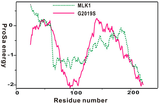 Comparative view of the ProSa energy profile for the homology-modeled structure of the G2019S mutant of LRRK2 and that of the template. The amino acids of the two proteins were renumbered from 1 for convenience.