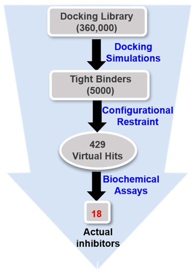 The applicability of molecular docking simulations to virtual screening has been limited by the roughness of the scoring function to calculate the binding affinity of a putative ligand to the target protein [41,42]. In this regard, most popular docking programs tend to underestimate the influence of ligand dehydration energy on protein–ligand binding. This leads to the overestimation of the biochemical potency of hydrophilic molecules [36]. Before virtual screening by docking simulations, therefore, a proper dehydration energy term derived with the extended solvent-contact model was substituted for the original one to enhance the reliability of the scoring function.