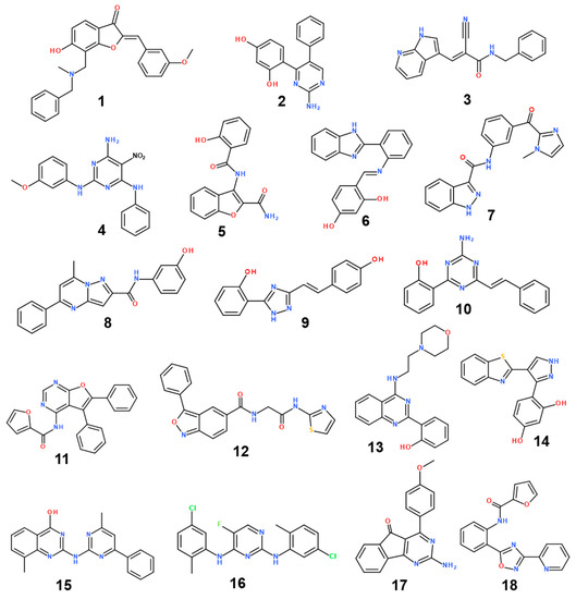 The structures and inhibitory activities of 18 new inhibitors of the G2019S mutant of LRRK2 are summarized in Figure 4 and Table 1, respectively, along with the molecular weights (MWs). A common feature of all the new inhibitors (Inhibitors 1–18) is that the hydrogen-bonding moieties are present in the middle of the molecular frameworks while the nonpolar aromatic groups reside in the terminal regions. Therefore, the hydrogen bond and the hydrophobic interactions seem to contribute cooperatively to binding in the ATP-binding site of the G2019S mutant of LRRK2. With respect to excluding the probability of being false positives in the enzyme inhibition assays, Inhibitors 1–18 were confirmed as lacking any substructure present in pan assay interference compounds [45]. As can be seen in Table 1, all 18 inhibitors exhibit reasonably high biochemical potencies ranging from the low micromolar level to the submicromolar level. They deserve consideration for further development to enhance biochemical potency and antiparkinsonian activity via structure–activity relationship (SAR) analysis because they were also screened computationally to possess desirable physicochemical properties as drug candidates. Inhibitors 2, 5, 9, and 10 are anticipated, in particular, to serve as a promising molecular core from which nanomolar inhibitors can be derivatized by chemical synthesis because their MWs are lower than 300 amu.