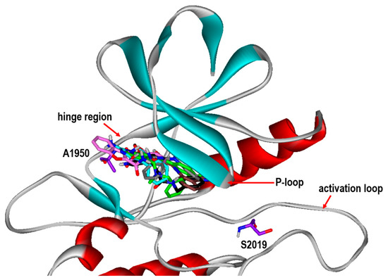 Comparative view of the binding modes of Inhibitors 1-6 in the ATP-binding sites of the G2019S mutant of LRRK2. The carbon atoms of LRRK2 and Inhibitors 1-6 are indicated in violet, green, cyan, black, gray, pink, and brown, respectively. The positions of Ala1950 in the hinge region and mutated Ser2019 are also indicated.