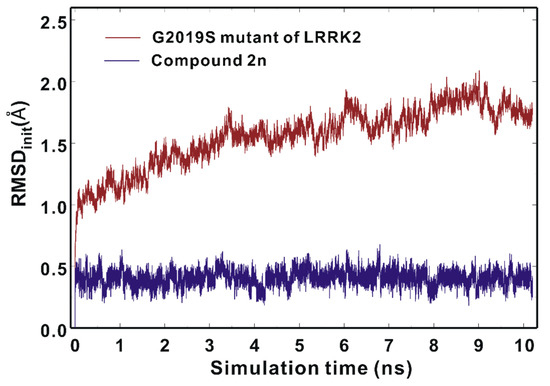 Time evolutions of the root-mean-square deviation (RMSDinit) of the backbone Cα atoms of the G2019S mutant (brown) and those of the heavy atoms of Inhibitor 2n (blue).