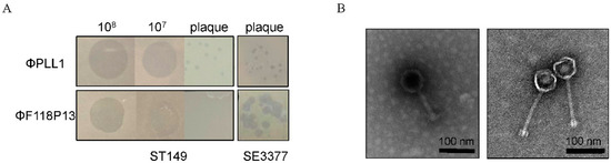Morphological characteristics of ΦPLL1 and ΦF118P13. (A) Examples of phage plaque morphologies of ΦPLL1 and ΦF118P13 against different serotypes of Salmonella. (B) Transmission electron micrograph of two phages. ΦPLL1 (left), ΦF118P13 (right). Scale bar, 100 nm. Representative image is shown.