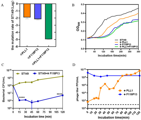 Comparison of the lytic activity of the phage combination and single phage alone on S. Typhimurium strain ST149 in vitro. (A) Mutation rates of ST149 resistance to phages. (B) Phages’ lytic activity on ST19 in vitro. Approximately 108 Salmonella cells alone, or cells mixed with single phage or phage combination (MOI = 1) were incubated aerobically at 37 °C in 96-well plates. OD600 was measured at 10 min intervals for 6 h. (C) ΦF118P13’s lytic ability on ST149. Approximately 108 Salmonella cells alone, or cells mixed with phages (MOI = 10) were incubated aerobically at 37 °C. Bacterial cells were determined by plating on LB plates. (D) The growth curve of ΦPLL1 and ΦF118P13’s proliferation in ST149. Approximately stationary phase 108 CFU/mL of bacterial cells were incubated with ΦPLL1 and ΦF118P13 in LB medium at an MOI of 0.01 and 10, respectively. Phage titer was determined by plating on double-layer agar plates. **** p < 0.0001 (Student’s t-test).