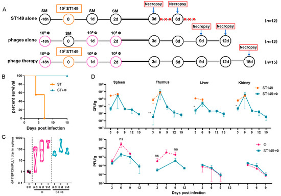 The phage combination protected mice against Salmonella systemic infections by inhibiting bacterial growth in organs. (A) Schematic depicting the experimental design, timeline, and treatment groups; × in red represents the number of dead mice. For the ST149 and phage combination control groups, 12 ICR mice were used in each group; for the phage combination-treated group, 15 mice were used. (B) Protection of the phage combination in infected mice. (C) The ratio of ΦF118P13 titer to ΦPLL1 titer in spleen in the phage alone group and the phage combination therapy group. (D) The bacterial load and phage titer in various organs. No data was obtained in the challenge group for 6 mice that died of Salmonella infection within 9 days. * p < 0.05 (Kruskal–Wallis test), ** p < 0.01; ns, no difference.