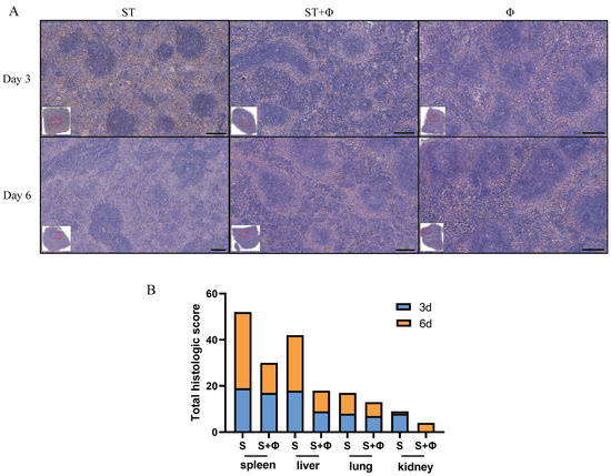 Histopathological examination showed massive hemolysis in the splenic red pulp, a reduction in white pulp area, and marked decreased lymphocytes in the spleen of Salmonella-challenged mice, whereas lymphocytes, neutrophils, and multinucleated giant cells in red pulp were markedly increased in mice treated with the phage combination (Figure 4A). Figure 4B shows that histological scores from organs of phage-treated mice were lower than those of infected mice that did not receive phage therapy, indicating that phage combination treatment prevented organ damage and reduced lesion severity.