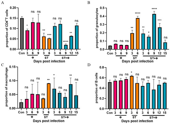 Phage therapy effect on immune responses in spleen in vivo. (A) Percentage of CD4+ T cells in live splenocytes. (B) Percentage of granulocytes in live splenocytes. (C) Percentage of macrophage in live splenocytes. (D) Percentage of B cells in live splenocytes. *, p < 0.05 (Kruskal–Wallis test), **, p < 0.01, ***, p < 0.001, ****, p < 0.0001; ns, no difference.