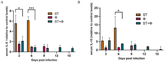 Phage therapy effect on inflammatory responses. (A) Serum levels of IL-6 on day 3 and day 6 post-infection relative to the level of IL-6 in the control group. (B) Serum levels of IL-10 on day 3 and day 6 post-infection relative to the level of IL-10 in the control group. *, p < 0.05 (ordinary one-way ANOVA), ***, p < 0.001.