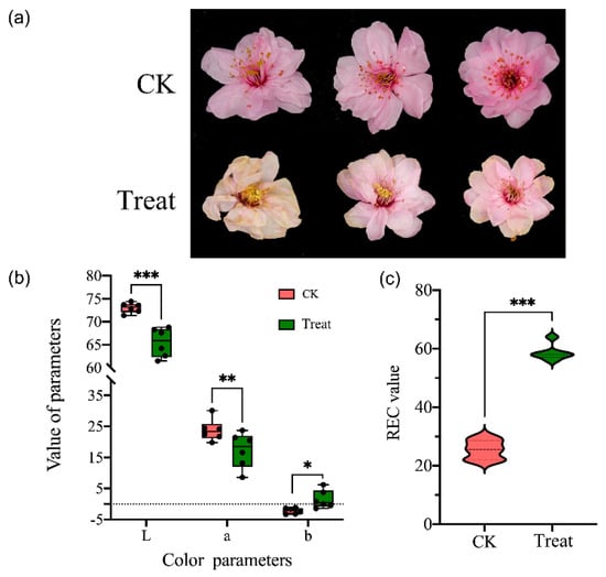 The morphology and color change of Prunus mume flowers in natural temperature (CK, 15 °C) and low-temperature treatment (−4 °C). (a) The morphology of P. mume flower of control and treatment groups. (b) The color parameters (CLE Lab) of petals of control and treatment groups, L is the lightness, a and b are two chromatic components measured. (c) The relative electrical conductivity (REC) of two groups. Significant differences were determined by Student’s t test, p < 0.05 (*), p < 0.01 (**), p < 0.001 (***).