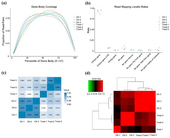 Quality control of transcriptome data and analysis of samples repeatability. CK means the control group (sampled at 15 °C), treat means the treatment group (sampled at −4 °C). (a) Randomness assessment of reads on reference genome. The abscissa is the relative position of the gene, the ordinate is the ratio of reads in the total aligned reads in the corresponding position interval, and different colors represent different samples. (b) Sample correlation analysis. This is a heatmap of the Pearson correlation coefficients between samples calculated based on all genes; the darker the color, the better the correlation between the two samples. (c) Cluster analysis between samples. (d) Sample correlation matrix analysis.