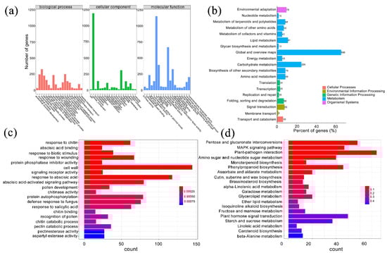 By differentially expressed gene (DEG) analysis, we identified 4425 genes differentially expressed in two samples: 3247 of them were upregulated in the treatment group, and 1178 genes were upregulated in control group (Table S3). To characterize the function of these DEGs, we used the gene ontology (GO) annotation to classify them into three component categories. Each category contained 20 GO terms, and most terms contained fewer than 500 genes. Nonetheless, there were several terms that showed many genes. Biological process, cellular component, and ion binding had the most genes in categories of biological process, cellular component, and molecular function, respectively (Figure 3a). We found 1530 DEGs in 19 KEGG pathways that covered five classes, cellular processes, environmental information processing, genetic information processing, metabolism, and the organismal system. The five pathways with the greatest number of genes were global and overview maps, carbohydrate metabolism, lipid metabolism, biosynthesis of secondary metabolites, and signal transduction (Figure 3b). We performed GO and KEGG enrichment analysis to obtain genes with similar functions and identify DEGs associated with the most important biological processes, biochemical metabolic pathways, and signal transduction pathways. We found 1005 genes enriched in the top 20 GO terms; the term ‘cell wall’ was enriched with the most genes, followed by ‘response to abscisic acid.’ The top three terms with the most significant enrichment were ‘response to chitin’, ‘abscisic acid binding’, and ‘response to biotic stimulus’ (Figure 3c). In KEGG enrichment, the top 20 pathways contained 418 DEGs, and the most significant pathways were ‘plant-pathogen interaction’, ‘pentose and glucuronate interconversions’, ‘MAPK signaling pathway’, ‘phenylpropanoid biosynthesis’, and ‘amino sugar and nucleotide sugar metabolism’ (Figure 3d).