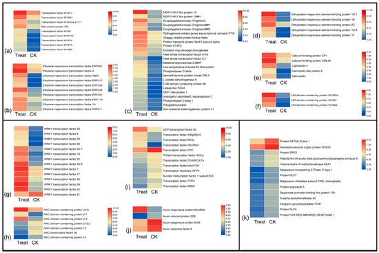 There were several types of TFs and genes that upregulated after low-temperature exposure, including MYB (Figure 4a) and ethylene-responsive transcription factors (Figure 4b), dehydration-responsive element-binding proteins, calmodulin-related proteins, LIM domain-containing proteins, and others involved in cell processes and biosynthesis (Figure 4c–f). The major members in the WRKY family were upregulated after low-temperature treatment, but WRKY21 was downregulated (Figure 4g). In the NAC family, the NAC domain-containing proteins JA2L and 2 had the highest expression level in the treatment sample, but NAC56 and other NAC domain-containing proteins were downregulated after low-temperature treatment (Figure 4h). In addition, the bZIP60, RF2b, and bHLH041 TFs showed high expression in the treatment group; conversely, CPC, bHLH130, NF-YB5, and SRM1 were upregulated in the natural temperature control group (Figure 4i). In addition, the auxin-related factors also showed different expression levels; only the auxin-responsive protein SAUR36 was upregulated after low-temperature treatment, others were downregulated, including the auxin-induced protein 22B, auxin-response protein IAA8, and auxin-response factor 6 (Figure 4j). Figure 4k present mainly low-temperature downregulated genes, such as SRG1, NLP7, and NLP4.