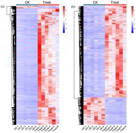 The differential metabolite hierarchical clustering analysis. (a) The differential metabolite heatmap of a positive ion. (b) The differential metabolite heatmap of negative ion. The magnitude of the relative amounts is shown by the difference in color, where the columns represent the samples, and the rows represent the metabolites. CK means the control group (sampled at 15 °C), treat means the treatment group (sampled at −4 °C).