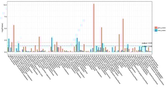 KEGG pathway analysis of differentially expressed genes (DEGs) and differentially accumulated metabolites (DAMs). The horizontal bar is the KEGG pathway, the vertical bar is the enrichment −log10 (p-value) value, the red in the ordinate represents the enrichment −log10 (p-value) value of differential genes, the green represents the enrichment −log10 (p-value) value of differential metabolites, the vertical axis. The higher the coordinate, the smaller the p-value value, and the stronger the enrichment.