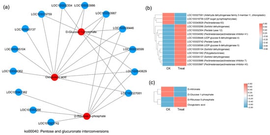 Correlation network diagram of the ko00041 pathway (pentose and glucuronate interconversions). (a) The correlation network diagram. Red color represents the enriched differential metabolites in the pathway, blue represents the differential genes enriched in the pathway, and the straight line represents the correlation between them. The higher the degree of the node, the more related straight lines, the node is considered more important. (b) The heatmap shows the expression level of correlated genes. (c) The heatmap shows the accumulation level of correlated metabolites.
