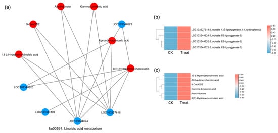 Correlation network diagram of the ko00591 pathway (linoleic acid metabolism). (a) The correlation network diagram. (b) The heatmap shows the expression level of correlated genes. (c) The heatmap shows the accumulation level of correlated metabolites.