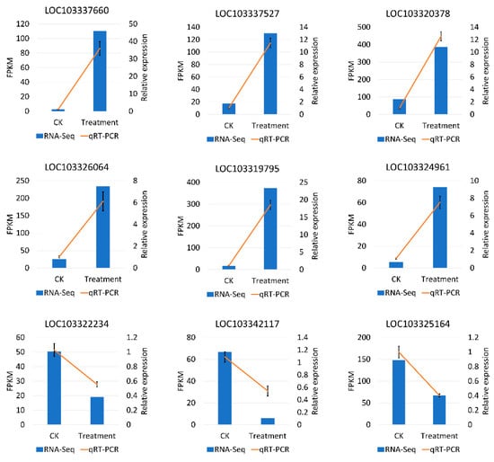qRT-PCR validation of the expression level of nine DEGs may respond to the low temperature during flowering in P. mume. The x-axis means the two groups in this study, and the y-axis means the FPKM by RNA-Seq and the relative quantitative expression level by qRT-PCR.