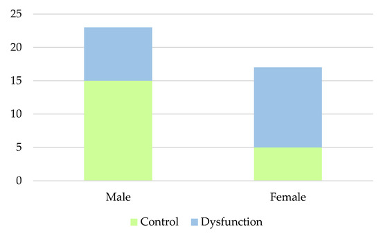 A demographic analysis of the 40 patients with KTx over a period of more than ten years is shown in Table 1 and Figure 1. Amongst all 40 patients, 12 out of 17 females and eight out of 23 males had previously undergone graft dysfunction. The graft dysfunction rate of the female KTx patients (71%) was shown to be significantly higher than that of male patients (35%), with a p-value < 0.05. The mean age of participants is oldest in the female control group and youngest in the male dysfunction group. Age when having received transplant shows similar results, with the oldest age being seen in the female control group and the youngest age seen in the male dysfunction group. Graft survival time length was calculated by subtracting the patient’s age when receiving transplant from their current age. This was shown to be longest in the female control group and shortest in the male dysfunction group.