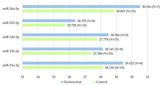 Mean Ct Value of differently expressed miRNAs in male patients. All of them were down-regulated in the male dysfunction group when compared to the male control group.