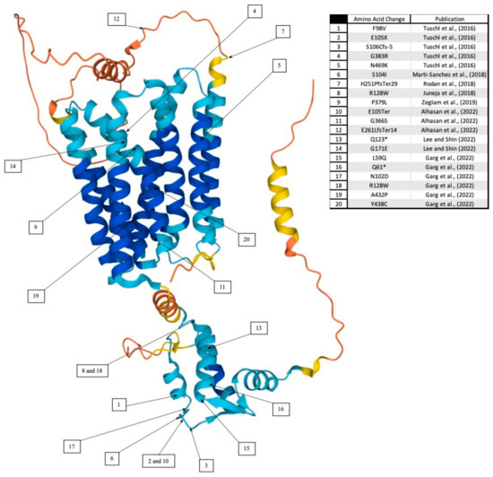 The protein structure of SLC39A14. The 3D structure was obtained using AlphaFold [31] (AF-Q15043-F1). Corresponding mutations and related work are indicated within the accompanying number table. Color gradient indicates model confidence (blue > 90; cyan 70–90; yellow 50–70; orange < 50). (See Refs. [6,24,25,26,27,28,29,30]).